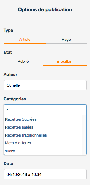 - Le choix des catégories dans les options de publication d'un article ou d'une page a été quelque peu simplifié. Dès lors que vous cliquez dans l'encart "Catégories" vous avez la liste déroulante de toutes vos catégories qui apparaît. L'auto-complétion est également présente au niveau des catégories : si vous commencez à taper une lettre dans cet encart alors vous verrez apparaître les catégories commençant par cette même lettre. Cette fonction est également complétée par l'affichage de vos autres catégories dans lesquelles figure la lettre que vous avez commencée à taper.