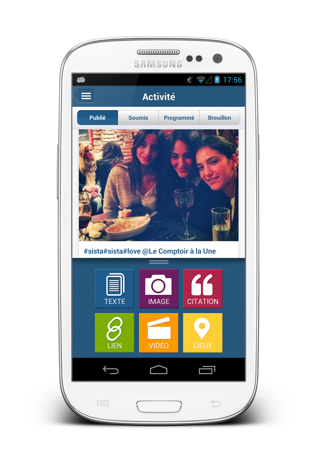Nous sommes alors prêts à publier l'article, une notification Android nous informe des étapes de publication (téléchargement d'image puis publication), la page d'activité est rafraîchie et notre article fraîchement posté y apparaît.